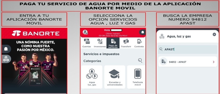 AHORA YA PUEDES PAGAR TU SERVICIO DE AGUA DESDE TU CELULAR SOLO TIENES QUE INGRESAR A LA APLICACIÓN DE BANORTE Y SEGUIR LOS PASOS DESCRITOS EN LA IMAGEN DE APOYO